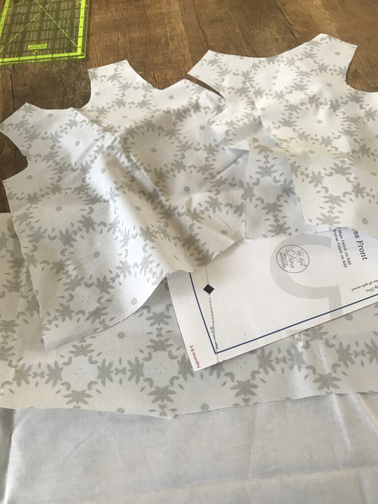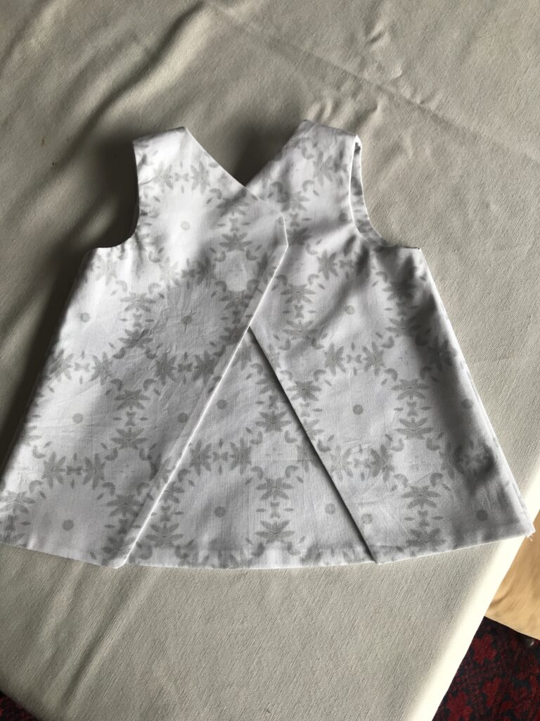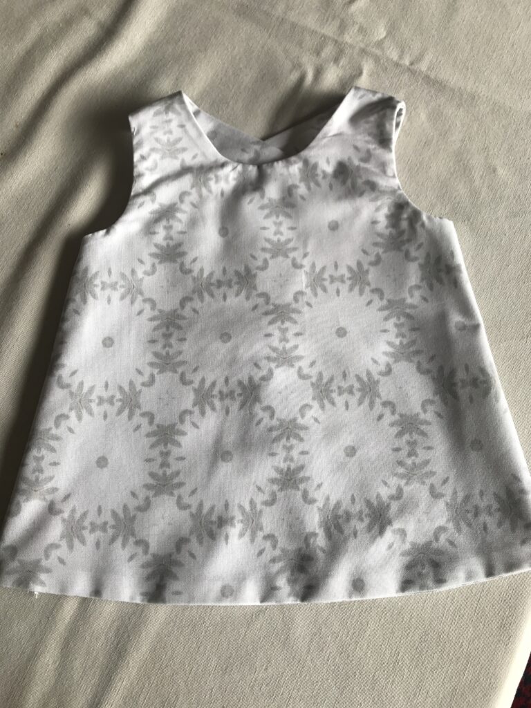 Ik had op dat moment net een testlapje laten drukken met een patroon dat ik zelf ontworpen had. Een zachte stof met grijze bloempatronen. Niet de meest logische keuze voor een babyjurkje – maar ik gebruikte wat ik had.